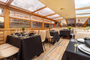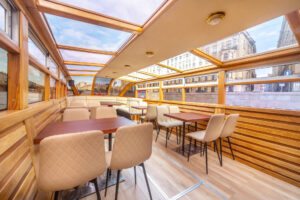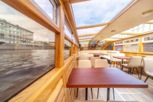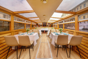 Закрытый салон, в салоне 10 столов и 42 стульев, плазма, микрофон, встроенная аудиосистема, санузел.Открытая палуба с мягким диваном по корме и складными стульями.