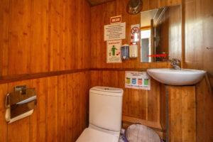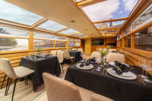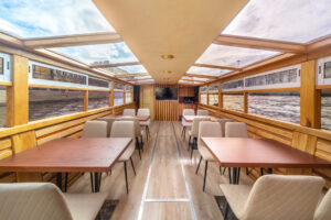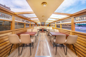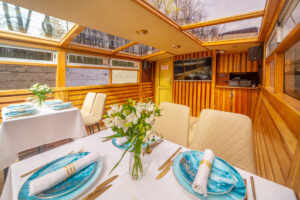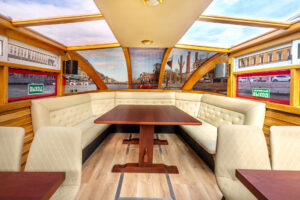 Закрытый салон, в салоне 4 стола и 16 стульев, диван и овальный стол, микрофон, встроенная аудиосистема, санузел, чайник.Открытая палуба диванчик с складными стульями.
