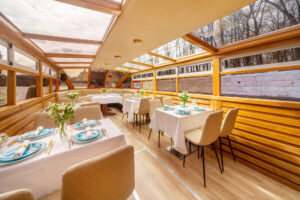 Пассажировместимость 35 человек. Банкетная рассадка на 20 гостей за разными столами. Банкетная рассадка на 12 гостей одним столом. Фуршетная рассадка до 30 гостей.7 500 руб\час