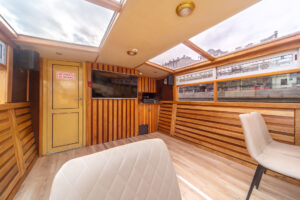 Закрытый салон, в салоне 5 столов и 21 стул, два мягких диванчика, плазма, микрофон, встроенная аудиосистема, санузел.Открытая палуба с мягким диваном по корме и складными стульями.