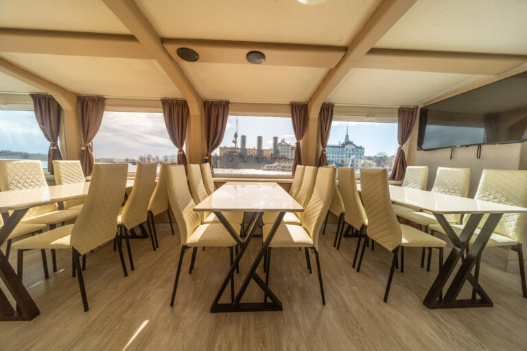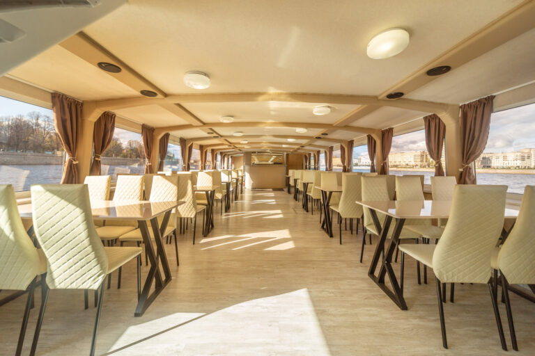 Закрытый салон на нижней палубе, в салоне 10 круглых столов и 6 прямоугольных, 84 мягких кресла, плазма, микрофон, встроенная ауди...