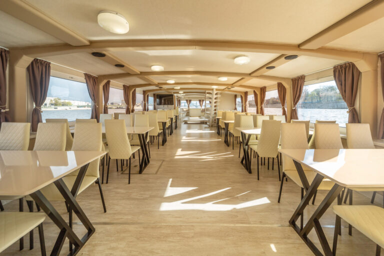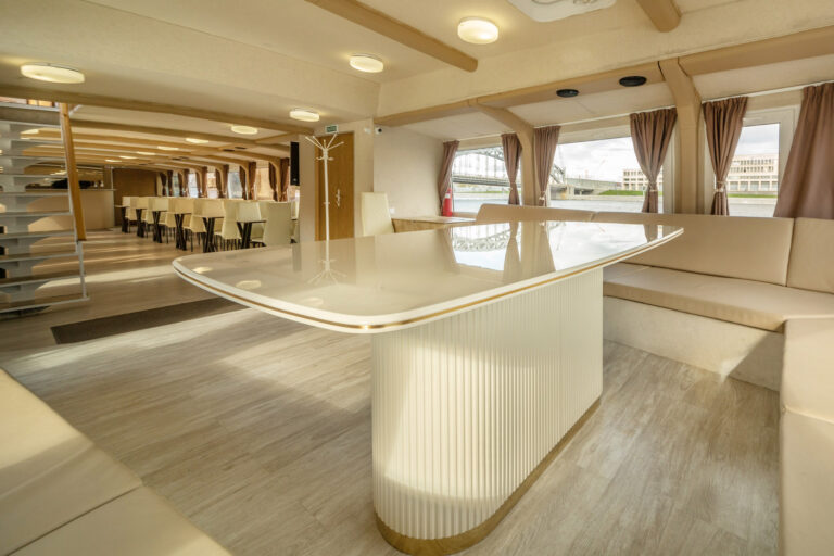 Закрытый салон нижняя палуба, в салоне 13 круглых столов и 78 стула, диван в носовой части, плазма, микрофон, встроенная аудиосистема, кондицио...