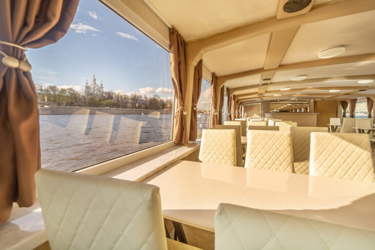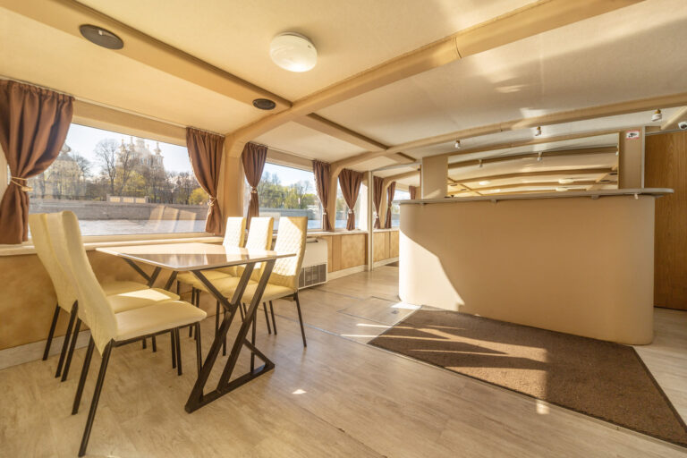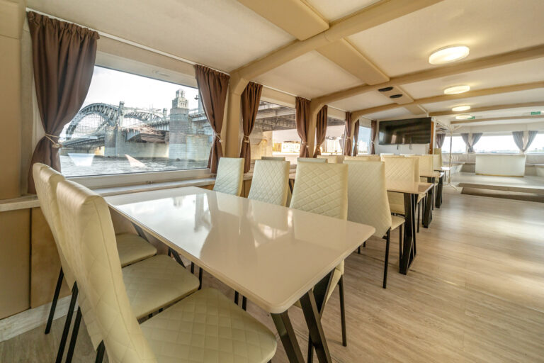 Уникальный проект в Петербурге. Однопалубный теплоход до 80 гостей - широкие подоконники - панорамная крыша, с возможностью открытия люка - мягкие диваны - барная стойка, оснащенная кофемашиной...